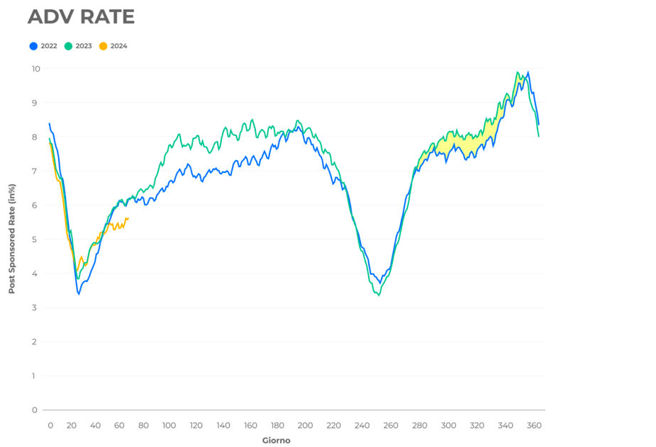 Nei primi due mesi del 2024 invece, nonostante un tasso di sponsorizzazione rimasto stabile, la post compliance ha registrato un ulteriore aumento medio del 9%, anche qui a ridosso di un altro evento significativo: il 10 Gennaio, ovvero il giorno dell’approvazione delle nuove linee guida AGCOM per gli influencer.